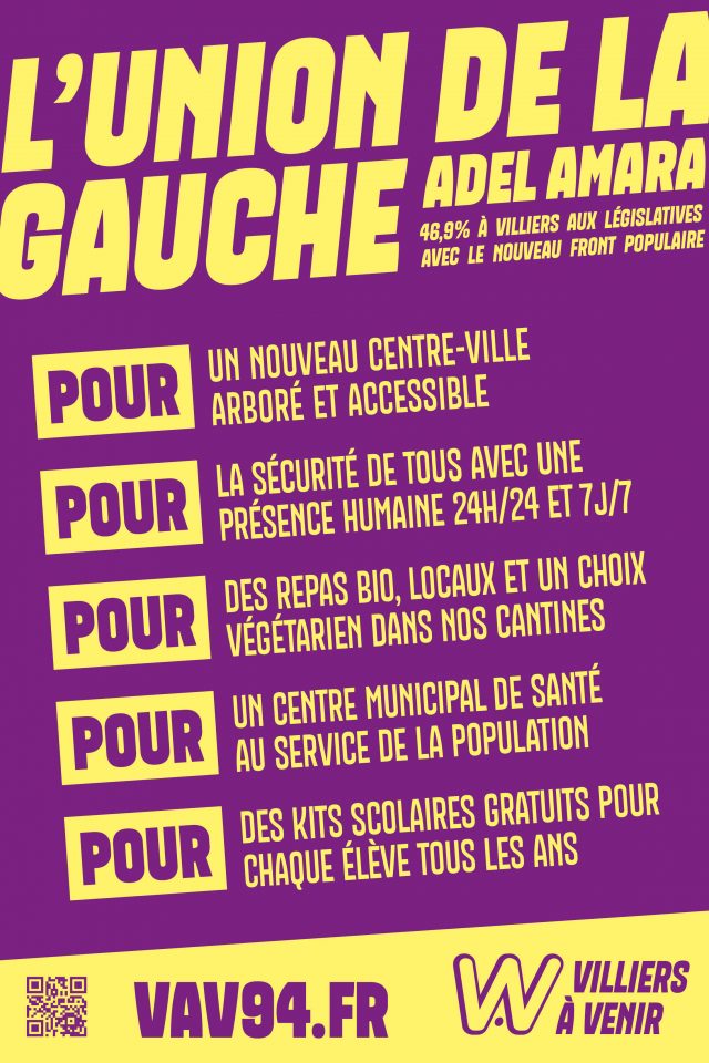 À l’approche des municipales 2026, nous vous dévoilons nos deux affiches de campagne qui portent la vision d’Adel Amara et de Villiers à Venir pour une ville juste, humaine et construite avec et pour ses habitant.e.s. Ces nouveaux visuels marquent une nouvelle étape du mouvement citoyen qui unie la Gauche depuis 2019 et affirme notre volonté commune d’agir concrètement pour le quotidien de toutes et tous.